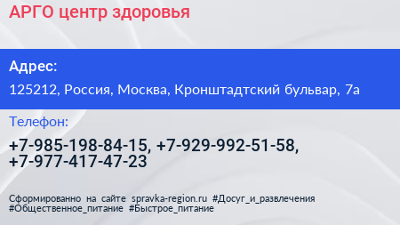 АРГО, центр здоровья по адресу 125212, Россия, Москва, Кронштадтский бульвар, 7а в дальнейшем Организация, размещена в следующих категориях: