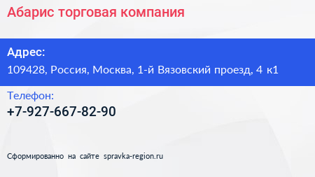 Абарис, торговая компания по адресу 109428, Россия, Москва, 1-й Вязовский проезд, 4 к1 в дальнейшем Организация, размещена в следующих категориях: