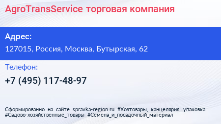 AgroTransService, торговая компания по адресу 127015, Россия, Москва, Бутырская, 62 в дальнейшем Организация, размещена в следующих категориях: