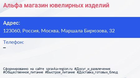 Альфа, магазин ювелирных изделий по адресу 123060, Россия, Москва, Маршала Бирюзова, 32 в дальнейшем Организация, размещена в следующих категориях: