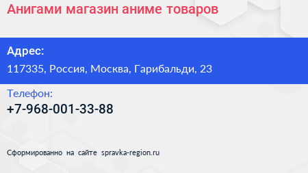 Анигами, магазин аниме-товаров по адресу 117335, Россия, Москва, Гарибальди, 23 в дальнейшем Организация, размещена в следующих категориях: