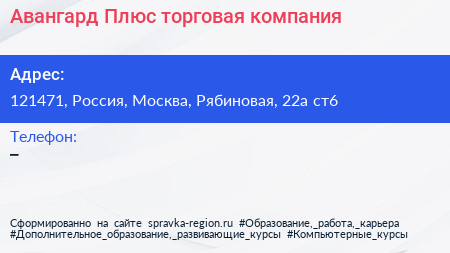 Авангард Плюс, торговая компания по адресу 121471, Россия, Москва, Рябиновая, 22а ст6 в дальнейшем Организация, размещена в следующих категориях:
