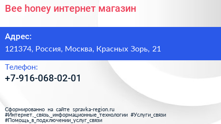 Bee honey, интернет-магазин по адресу 121374, Россия, Москва, Красных Зорь, 21 в дальнейшем Организация, размещена в следующих категориях: