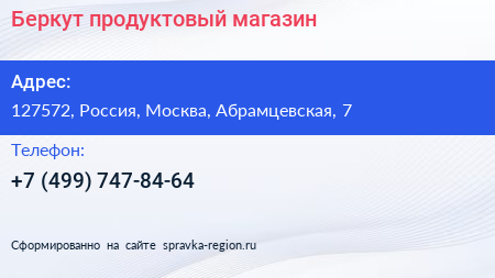 Беркут, продуктовый магазин по адресу 127572, Россия, Москва, Абрамцевская, 7 в дальнейшем Организация, размещена в следующих категориях: