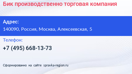 Бик, производственно-торговая компания по адресу 140090, Россия, Москва, Алексеевская, 5 в дальнейшем Организация, размещена в следующих категориях: