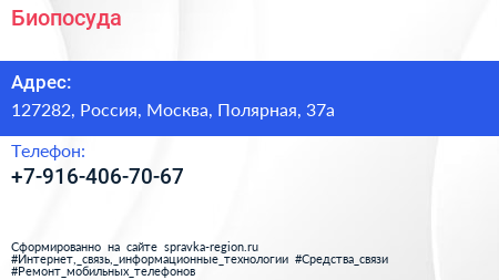 Биопосуда по адресу 127282, Россия, Москва, Полярная, 37а в дальнейшем Организация, размещена в следующих категориях: