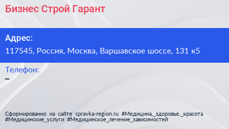 Бизнес Строй Гарант по адресу 117545, Россия, Москва, Варшавское шоссе, 131 к5 в дальнейшем Организация, размещена в следующих категориях: