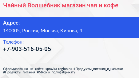 Чайный Волшебник, магазин чая и кофе по адресу 140005, Россия, Москва, Кирова, 4 в дальнейшем Организация, размещена в следующих категориях: