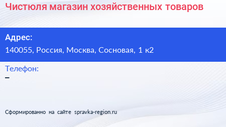 Чистюля, магазин хозяйственных товаров по адресу 140055, Россия, Москва, Сосновая, 1 к2 в дальнейшем Организация, размещена в следующих категориях: