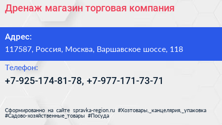 Дренаж-магазин, торговая компания по адресу 117587, Россия, Москва, Варшавское шоссе, 118 в дальнейшем Организация, размещена в следующих категориях: