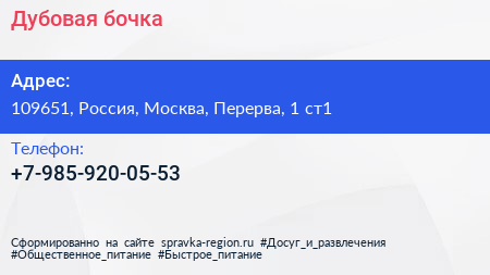 Дубовая бочка по адресу 109651, Россия, Москва, Перерва, 1 ст1 в дальнейшем Организация, размещена в следующих категориях: