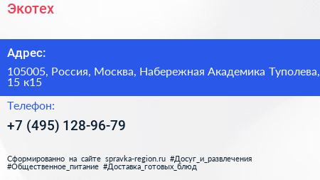 Экотех по адресу 105005, Россия, Москва, Набережная Академика Туполева, 15 к15 в дальнейшем Организация, размещена в следующих категориях: