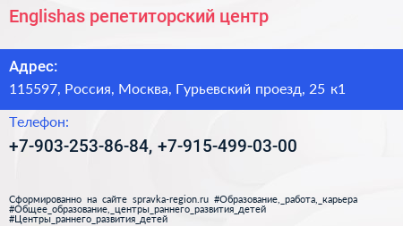Englishas, репетиторский центр по адресу 115597, Россия, Москва, Гурьевский проезд, 25 к1 в дальнейшем Организация, размещена в следующих категориях:
