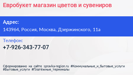 Евробукет, магазин цветов и сувениров по адресу 143964, Россия, Москва, Дзержинского, 11а в дальнейшем Организация, размещена в следующих категориях: