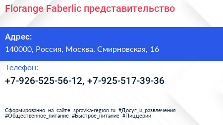 Florange & Faberlic, представительство по адресу 140000, Россия, Москва, Смирновская, 16 в дальнейшем Организация, размещена в следующих категориях: