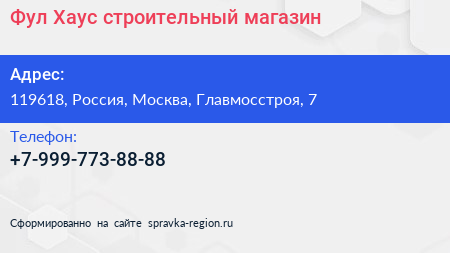 Фул Хаус, строительный магазин по адресу 119618, Россия, Москва, Главмосстроя, 7 в дальнейшем Организация, размещена в следующих категориях: