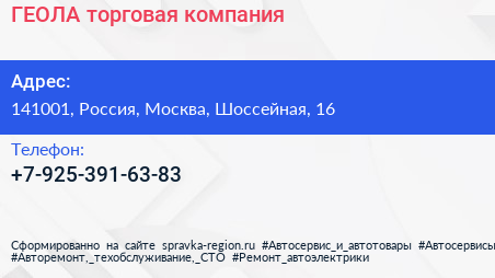 ГЕОЛА, торговая компания по адресу 141001, Россия, Москва, Шоссейная, 16 в дальнейшем Организация, размещена в следующих категориях: