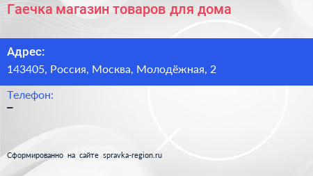 Гаечка, магазин товаров для дома по адресу 143405, Россия, Москва, Молодёжная, 2 в дальнейшем Организация, размещена в следующих категориях: