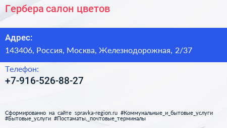 Гербера, салон цветов по адресу 143406, Россия, Москва, Железнодорожная, 2/37 в дальнейшем Организация, размещена в следующих категориях: