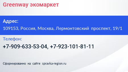 Greenway, экомаркет по адресу 109153, Россия, Москва, Лермонтовский проспект, 19/1 в дальнейшем Организация, размещена в следующих категориях: