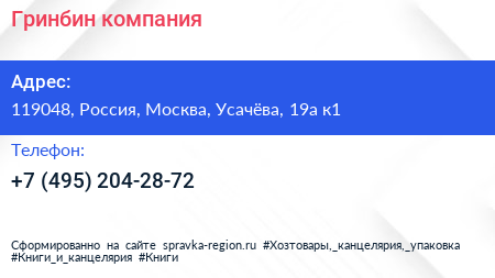 Гринбин, компания по адресу 119048, Россия, Москва, Усачёва, 19а к1 в дальнейшем Организация, размещена в следующих категориях: