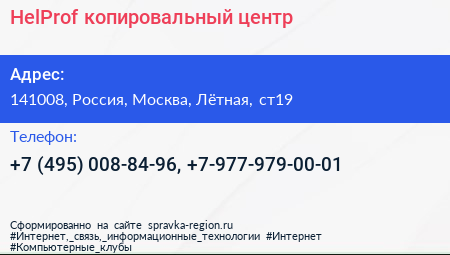 HelProf, копировальный центр по адресу 141008, Россия, Москва, Лётная, ст19 в дальнейшем Организация, размещена в следующих категориях: