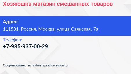 Хозяюшка, магазин смешанных товаров по адресу 111531, Россия, Москва, улица Саянская, 7а в дальнейшем Организация, размещена в следующих категориях: