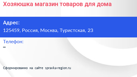 Хозяюшка, магазин товаров для дома по адресу 125459, Россия, Москва, Туристская, 23 в дальнейшем Организация, размещена в следующих категориях: