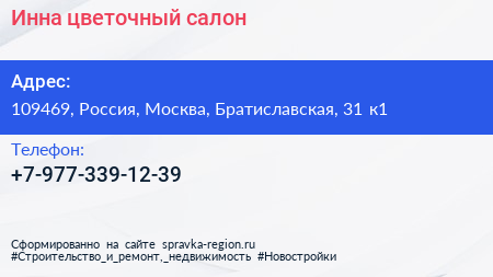 Инна, цветочный салон по адресу 109469, Россия, Москва, Братиславская, 31 к1 в дальнейшем Организация, размещена в следующих категориях:
