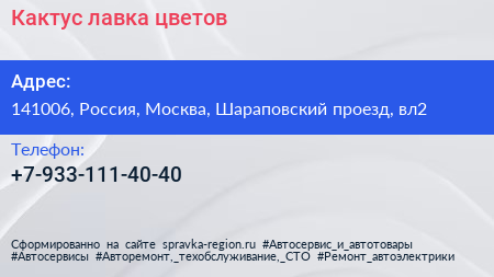 Кактус, лавка цветов по адресу 141006, Россия, Москва, Шараповский проезд, вл2 в дальнейшем Организация, размещена в следующих категориях: