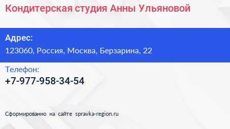Кондитерская студия Анны Ульяновой по адресу 123060, Россия, Москва, Берзарина, 22 в дальнейшем Организация, размещена в следующих категориях: