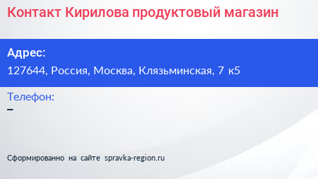 Контакт Кирилова, продуктовый магазин по адресу 127644, Россия, Москва, Клязьминская, 7 к5 в дальнейшем Организация, размещена в следующих категориях: