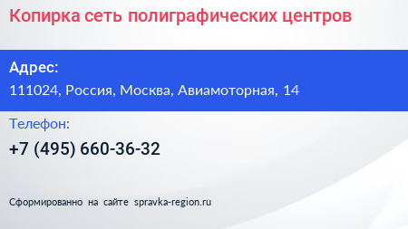 Копирка, сеть полиграфических центров по адресу 111024, Россия, Москва, Авиамоторная, 14 в дальнейшем Организация, размещена в следующих категориях: