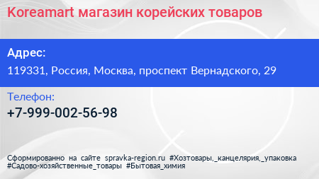Koreamart, магазин корейских товаров по адресу 119331, Россия, Москва, проспект Вернадского, 29 в дальнейшем Организация, размещена в следующих категориях: