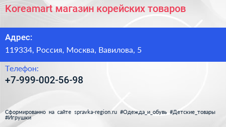 Koreamart, магазин корейских товаров по адресу 119334, Россия, Москва, Вавилова, 5 в дальнейшем Организация, размещена в следующих категориях: