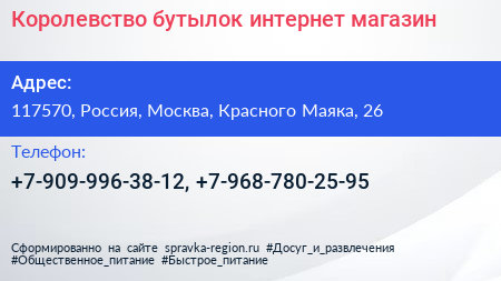 Королевство бутылок, интернет-магазин по адресу 117570, Россия, Москва, Красного Маяка, 26 в дальнейшем Организация, размещена в следующих категориях: