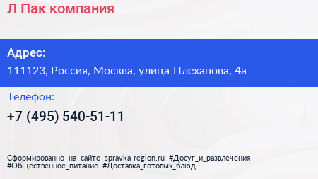 Л-Пак, компания по адресу 111123, Россия, Москва, улица Плеханова, 4а в дальнейшем Организация, размещена в следующих категориях: