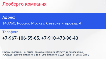 Леоберто, компания по адресу 143960, Россия, Москва, Северный проезд, 4 в дальнейшем Организация, размещена в следующих категориях:
