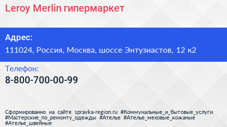 Leroy Merlin, гипермаркет по адресу 111024, Россия, Москва, шоссе Энтузиастов, 12 к2 в дальнейшем Организация, размещена в следующих категориях: