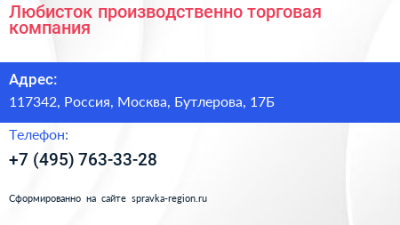 Любисток, производственно-торговая компания по адресу 117342, Россия, Москва, Бутлерова, 17Б в дальнейшем Организация, размещена в следующих категориях: