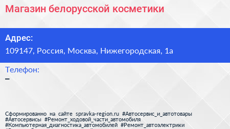 Магазин белорусской косметики по адресу 109147, Россия, Москва, Нижегородская, 1а в дальнейшем Организация, размещена в следующих категориях: