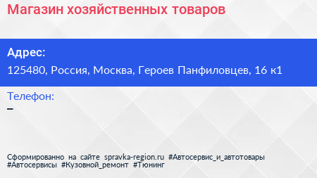 Магазин хозяйственных товаров по адресу 125480, Россия, Москва, Героев Панфиловцев, 16 к1 в дальнейшем Организация, размещена в следующих категориях: