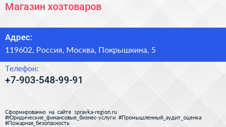 Магазин хозтоваров по адресу 119602, Россия, Москва, Покрышкина, 5 в дальнейшем Организация, размещена в следующих категориях: