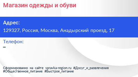 Магазин одежды и обуви по адресу 129327, Россия, Москва, Анадырский проезд, 17 в дальнейшем Организация, размещена в следующих категориях: