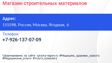Магазин строительных материалов по адресу 115598, Россия, Москва, Ягодная, 6 в дальнейшем Организация, размещена в следующих категориях: