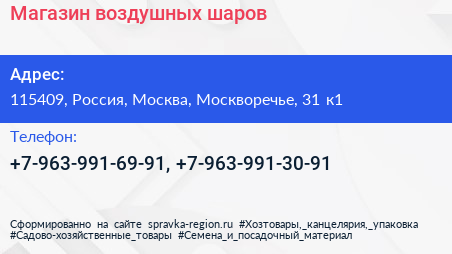 Магазин воздушных шаров по адресу 115409, Россия, Москва, Москворечье, 31 к1 в дальнейшем Организация, размещена в следующих категориях: