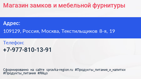 Магазин замков и мебельной фурнитуры по адресу 109129, Россия, Москва, Текстильщиков 8-я, 19 в дальнейшем Организация, размещена в следующих категориях: