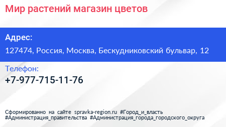 Мир растений, магазин цветов по адресу 127474, Россия, Москва, Бескудниковский бульвар, 12 в дальнейшем Организация, размещена в следующих категориях: