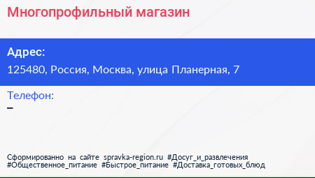 Многопрофильный магазин по адресу 125480, Россия, Москва, улица Планерная, 7 в дальнейшем Организация, размещена в следующих категориях: