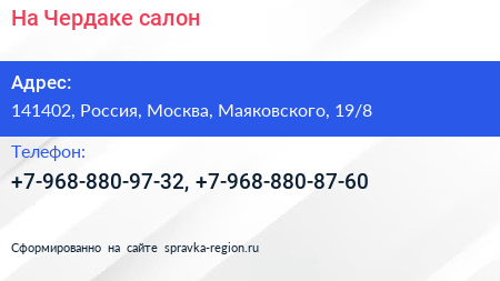 На Чердаке, салон по адресу 141402, Россия, Москва, Маяковского, 19/8 в дальнейшем Организация, размещена в следующих категориях: